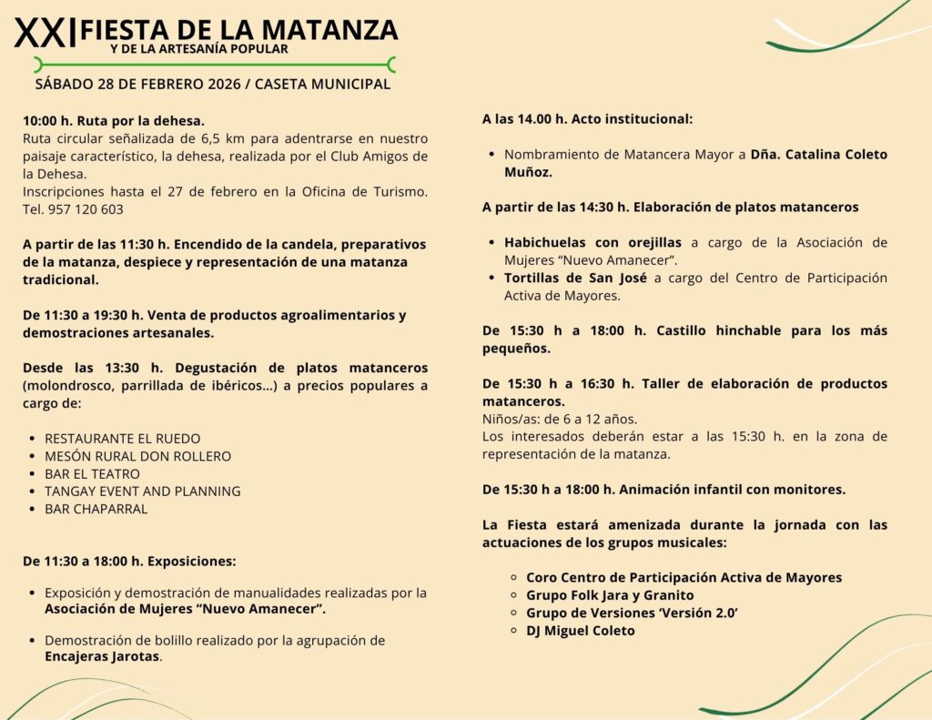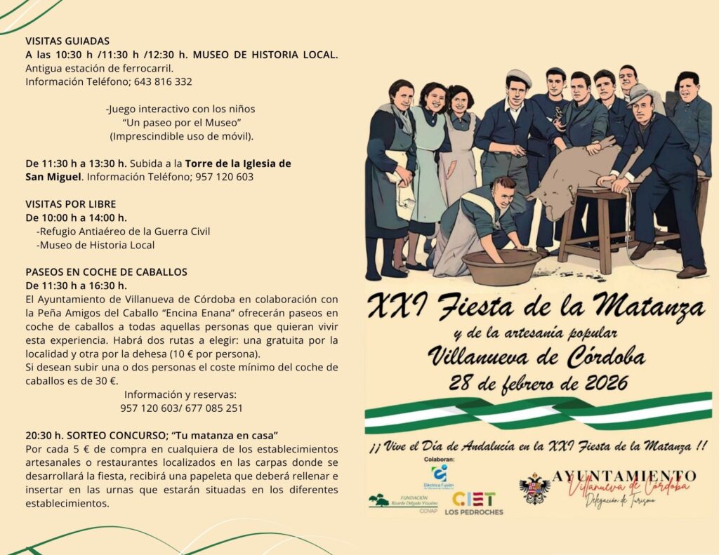 El Sábado 28 de febrero de 2026, Día de Andalucía, Villanueva de Córdoba volverá a latir al ritmo de sus raíces con la celebración de la XXI Fiesta de la Matanza y de la Artesanía Popular, una de las citas más consolidadas y queridas del calendario festivo jarote.