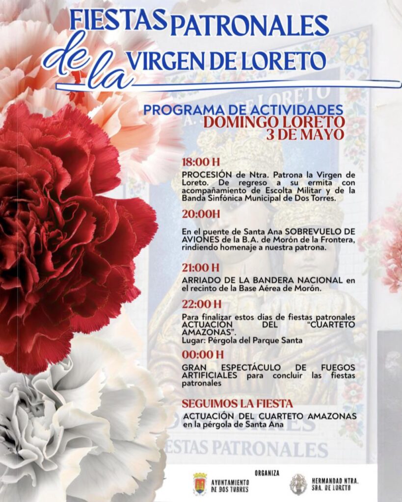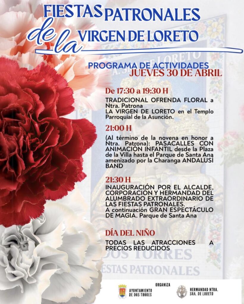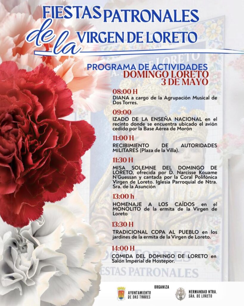 Durante cuatro jornadas, el municipio vivirá intensamente unos días en los que la fiesta se mezcla con el sentimiento patronal y con algunos de los momentos más esperados del calendario local. Desde la ofrenda floral y el encendido del alumbrado extraordinario hasta el pregón del Domingo de Loreto, la procesión de la Virgen, el homenaje militar, la verbena y los fuegos artificiales, Dos Torres volverá a mostrar una de sus celebraciones más queridas.