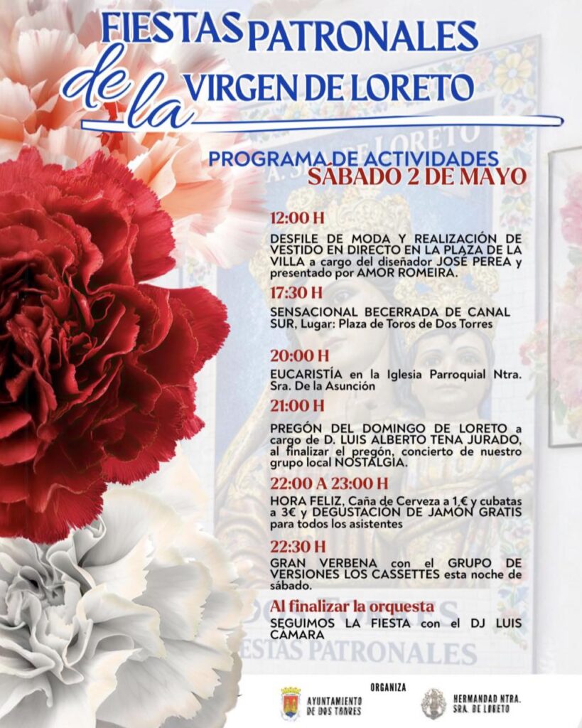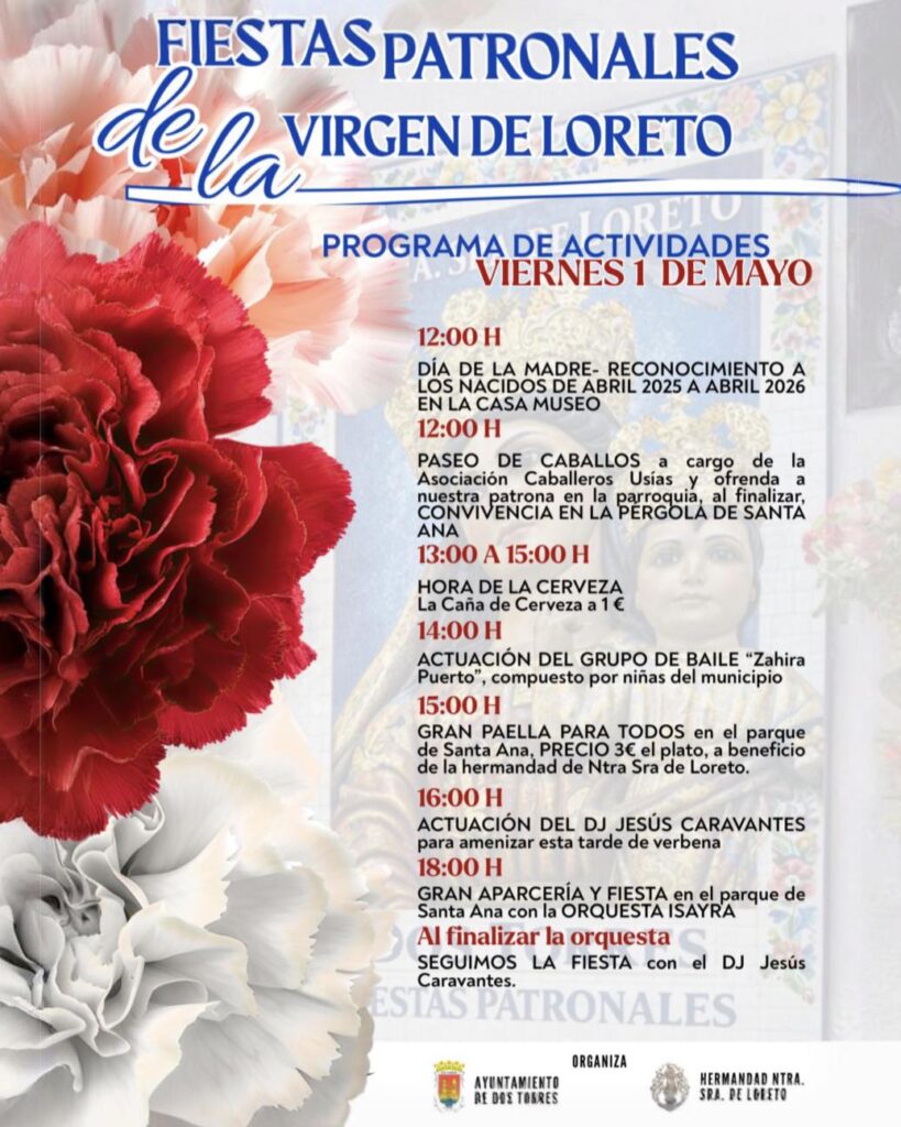Las Fiestas Patronales de la Virgen de Loreto volverán a llenar de ambiente, tradición y devoción las calles de Dos Torres del 30 de abril al 3 de mayo de 2026. Se trata de una de las celebraciones más señaladas del municipio, una cita que cada año reúne a vecinos, familias, hermandad, autoridades y visitantes en torno a la patrona y a un programa que combina actos religiosos, ambiente popular, música, convivencia y actividades para todas las edades.